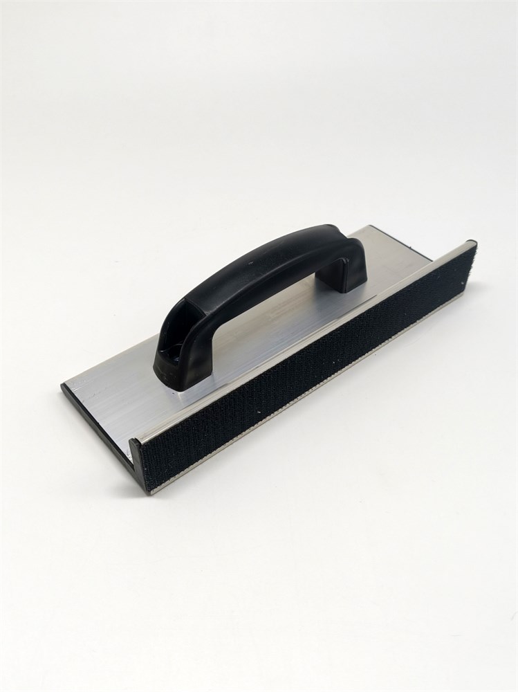 Площадка оснащена удобной чёрной ручкой, которая обеспечивает устойчивый и надёжный хват, снижает утомляемость рук при длительной работе и даёт хороший контроль над инструментом. Поверхность блока приспособлена для надёжного крепления наждачной бумаги — бумага фиксируется на площадке, не смещается во время движения и позволяет равномерно обрабатывать материал.