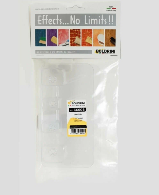 Декоративный шпатель Boldrini с двойной лопаткой (ширина 160 мм) — специализированный отделочный инструмент из прочного пластика, предназначенный для работы с декоративными покрытиями, лессирующими составами, восками и фактурными штукатурками. Благодаря двойной лопатке мастеру легче контролировать силу нажима и создавать выразительные декоративные эффекты на поверхности. Инструмент разработан для использования при декоративной отделке стен и других поверхностей как в домашних условиях, так и в профессиональных ремонтных работах.