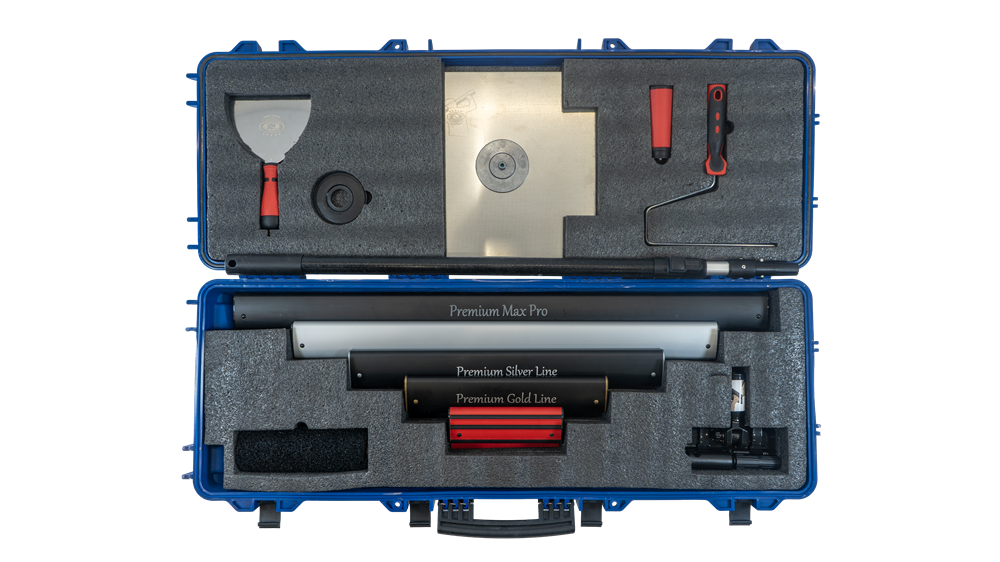 Кейс на колесах с поролоновым ложементом надежно фиксирует все инструменты и защищает их при транспортировке, а наличие различных шпателей и валика позволяет выполнять работы быстрее и качественнее.