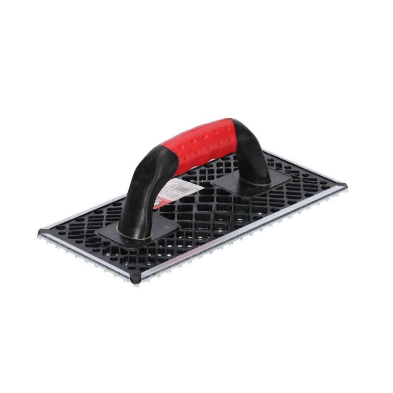 Рабочая поверхность изготовлена из прочного пластика, который не повреждает пенополистирол, обеспечивает равномерное распределение клеевых составов и снижает риск образования пустот под плитами. Размер рабочей части 380 × 160 мм позволяет быстро и эффективно обрабатывать большие участки теплоизоляции.