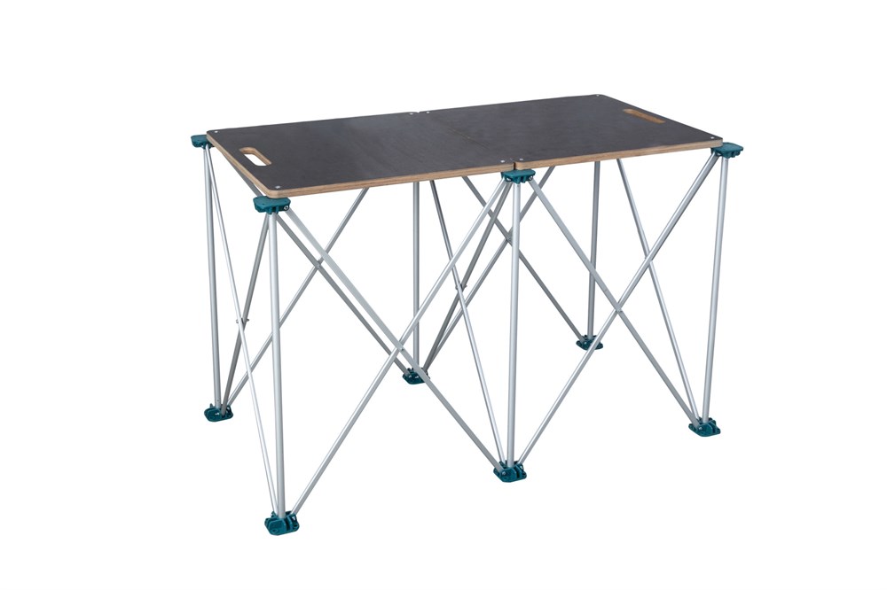 Стол состоит из горизонтально расположенных столешниц и вертикально расположенных опорных стоек, каждая из которых состоит из двух вставленных друг в друга алюминиевых труб.