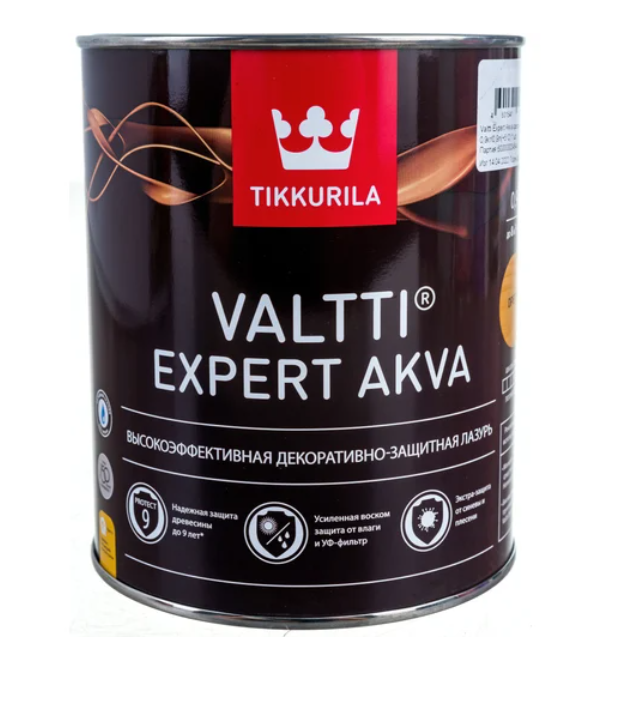Tikkurila Valtti Expert Akva — это высокоэффективный антисептик-лазурь для обработки и защиты древесины в наружных условиях. Он представляет собой декоративно-защитное покрытие, которое глубоко проникает в волокна дерева, обеспечивая длительную защиту от атмосферных воздействий, влаги, УФ-лучей, плесени, синевы и гниения. Состав подчёркивает естественную текстуру древесины, не скрывая её рисунок, и может быть колерован в разные тона по каталогам Tikkurila Valtti.