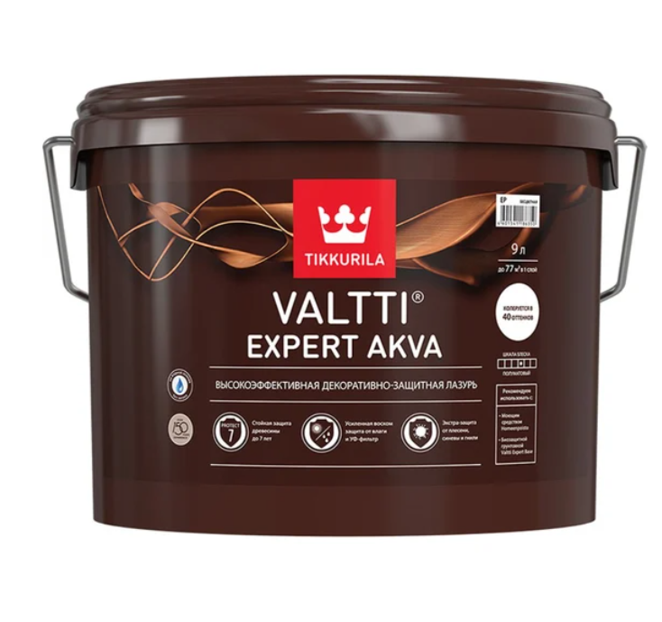 Tikkurila Valtti Expert Akva — это высокоэффективный антисептик-лазурь для обработки и защиты древесины в наружных условиях. Он представляет собой декоративно-защитное покрытие, которое глубоко проникает в волокна дерева, обеспечивая длительную защиту от атмосферных воздействий, влаги, УФ-лучей, плесени, синевы и гниения. Состав подчёркивает естественную текстуру древесины, не скрывая её рисунок, и может быть колерован в разные тона по каталогам Tikkurila Valtti.