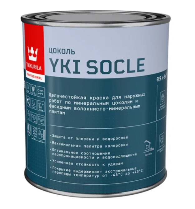 Tikkurila Yki Socle — это высококачественная водно-дисперсионная матовая краска для цоколя, созданная для наружной окраски бетонных цоколей, цоколей на цементной основе и фасадных волокнисто-минеральных плит. Покрытие устойчиво к щелочам, атмосферным воздействиям, влаге и механическим нагрузкам, что делает её особенно подходящей для защиты нижней части фасада перед декоративным оформлением здания.