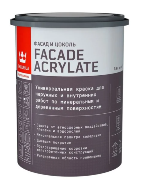 TIKKURILA Facade Acrylate — это водно-дисперсионная акрилатная фасадная краска с глубокоматовым эффектом, предназначенная для долговечной защиты и декоративной отделки наружных фасадов, цоколей и стен зданий. Покрытие устойчиво к атмосферным воздействиям, УФ-излучению, загрязнениям и влаге, благодаря чему помогает поддерживать эстетичный вид фасада на протяжении многих лет.
