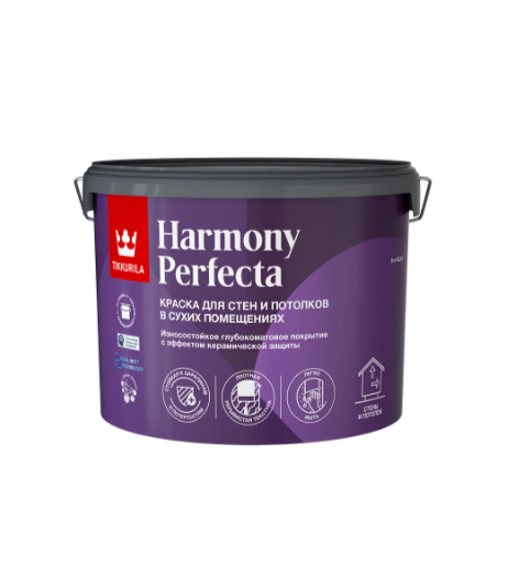 Tikkurila Harmony Perfecta — это высококачественная интерьерная водоразбавляемая краска с глубокоматовым (почти бархатистым) эффектом, разработанная для долговременной и эстетичной отделки стен и потолков в сухих помещениях. Покрытие устойчиво к царапинам, потертостям, пятнам и загрязнениям, обладает плотной, укрывистой структурой и легко моется, что делает её подходящей для комнат с высокой эксплуатационной нагрузкой (прихожие, гостиные, детские и т. п.).