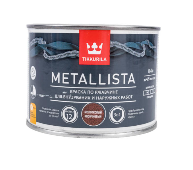 TIKKIVALA Metallista Hammer — это красочная эмаль по ржавчине 3 в 1 с молотковым эффектом: она сочетает в себе функции преобразователя ржавчины, антикоррозионной грунтовки и декоративного покрытия одновременно. Такое решение упрощает подготовку поверхности — краска хорошо защищает металл даже при наличии ржавчины без необходимости сложной очистки. Эмаль подходит как для наружных, так и для внутренних металлических конструкций и изделий.