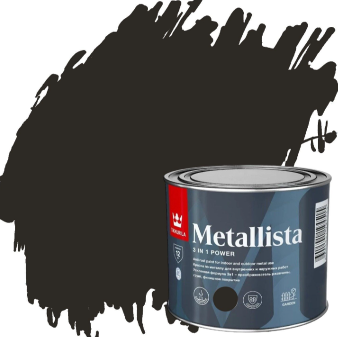 Tikkurila Metallista — это антикоррозионная эмаль‑краска по ржавчине с глянцевым финишем, предназначенная для защиты и декорирования металлических поверхностей как внутри, так и снаружи помещений. Благодаря форме «3 в 1» она совмещает свойства преобразователя ржавчины, грунтовки и декоративной краски в одном составе, что позволяет применять её вне значительной подготовки поверхности. Воск и активные компоненты в составе взаимодействуют с поверхностной ржавчиной, замедляя её распространение, а барьерный слой не даёт влаге и грязи проникать к металлу. Покрытие устойчиво к атмосферным воздействиям и грязи, а глянцевый блестящий слой добавляет эстетичный вид конструкции (ворота, ограждения, металлическая мебель и т.п.).
