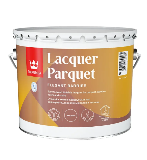 Tikkurila Lacquer Parquet EP (глянцевый) — это износостойкий алкидно‑уретановый лак для внутренних работ, предназначенный для защитно‑декоративной лакировки паркетных и деревянных полов, лестниц, ступеней, а также элементов мебели внутри помещений. Он создаёт глянцевую, прозрачную плёнку, которая усиливает структуру древесины, подчёркивает её естественную текстуру и одновременно обеспечивает надёжную защиту от механических повреждений, влаги и бытовых моющих средств.