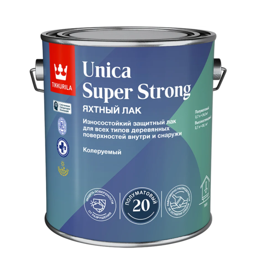 TIKKIVALA Unica Super Strong EP (полуматовый) — это универсальный защитный лак на основе уретано‑алкидной смолы с полуматовым (полугладким, низким блеском) финишем. Он предназначен для лакировки деревянных поверхностей как внутри, так и снаружи помещений и обеспечивает надёжную защиту от износа, механических нагрузок, влаги и УФ‑излучения благодаря компонентам, замедляющим пожелтение древесины под воздействием солнца.
