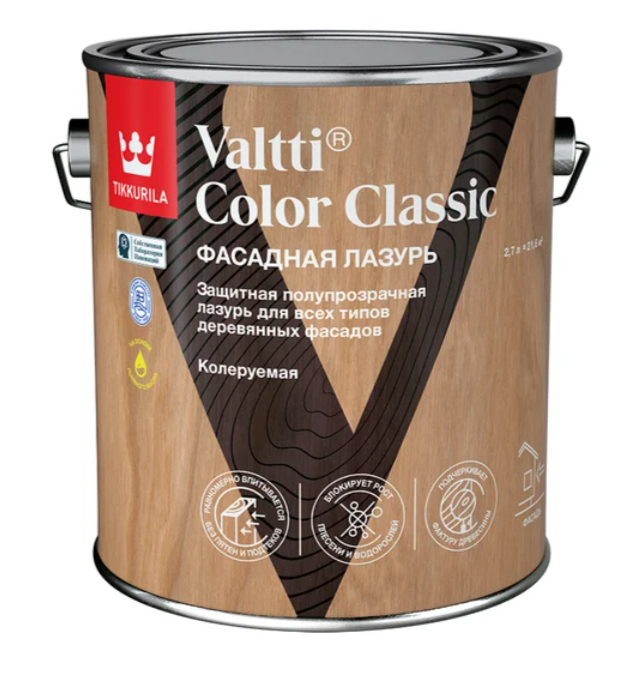 Tikkurila Valtti Color (Classic EC) — это масляная, растворительно-разбавляемая полупрозрачная лазурь (wood stain) для наружной защиты деревянных поверхностей. Продукт глубоко впитывается в древесину и не образует плотной плёнки после первого слоя, придавая поверхности естественный матовый цвет и подчёркивая текстуру древесины. Лазурь обеспечивает защиту от атмосферных воздействий — влаги, ультрафиолета и погодных колебаний — замедляя разрушение древесины и выцветание покрытия.