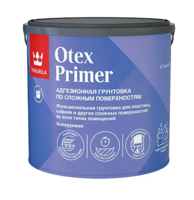 Tikkurila Otex Primer (база A) — это профессиональная адгезионная грунтовка, разработанная для подготовки сложных и «трудно сцепляющихся» оснований перед покраской. Она улучшает адгезию последующих красочных покрытий и служит прочной основой для декоративных красок внутри помещений.