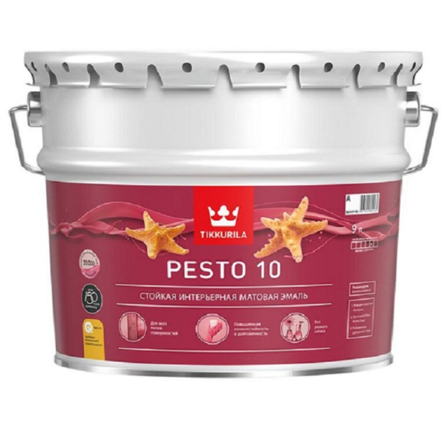 Pesto 10 - матовая интерьерная эмаль без резкого запаха. Универсальна, используется для окраски деревянных, ДВП, ДСП, металлических и минеральных поверхностей. Отлично подходит для стен и потолков, требующих частого мытья, а также дверей, мебели, отопительных радиаторов.