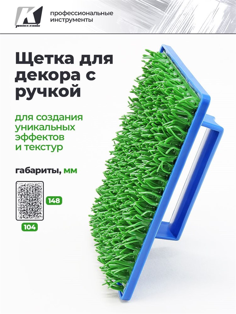 Синяя эргономичная ручка обеспечивает удобный захват и контроль движения, что особенно важно при создании повторяющихся узоров. Щётка совместима с декоративными красками, лессирующими составами, лазурями и тонкослойными штукатурками.