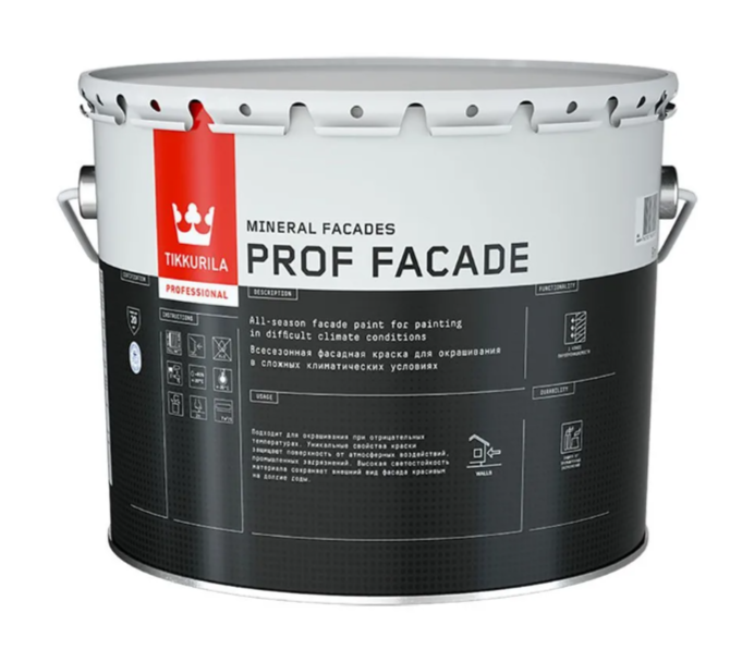 Tikkurila Prof Facade — всесезонная органоразбавляемая фасадная краска глубокоматового финиша, созданная для высококачественной декоративной и защитной отделки фасадов зданий и сооружений по минеральным основаниям. Она предназначена для наружных работ в сложных климатических условиях, включая холод, ветер и осадки. Краска образует прочную, матовую, устойчивую к атмосферным воздействиям поверхность, защищая фасад от выцветания, загрязнений и деформаций.