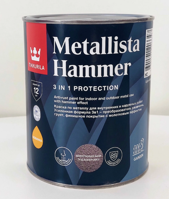 TIKKIVALA Metallista Hammer HC — это атмосферостойкая декоративная краска по ржавчине с эффектом «молотковой» поверхности, предназначенная для окраски металлических поверхностей (сталь, чугун) как снаружи, так и внутри помещений. Покрытие сочетает в себе сразу несколько функций: