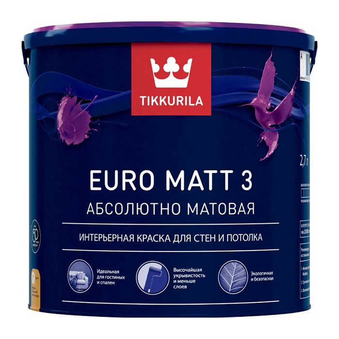 Tikkurila Euro Matt 3 — это интерьерная водоразбавляемая краска с глубокоматовым (почти без блеска) финишем, предназначенная для качественной отделки стен и потолков в сухих помещениях. Она обеспечивает ровное, эстетичное матовое покрытие, которое скрывает мелкие дефекты поверхности и создаёт спокойную, благородную поверхность.
